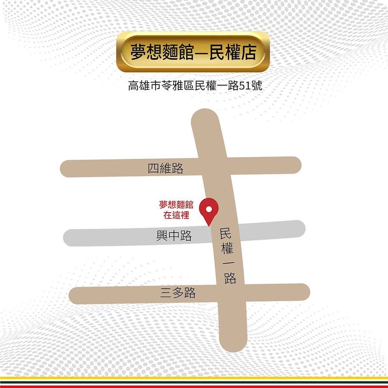 夢想麵館表示,民權店的成立不只是據點擴張,更是品牌深耕高雄的重要一步。品牌一路以來強調「用心煮好每一碗麵」,將料理視為情感交流的媒介,希望新門市能成為鄰里日常用餐、交流與放鬆的所在。