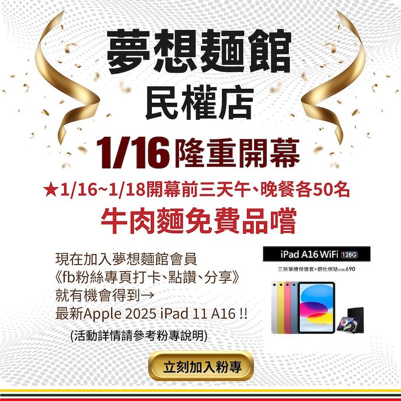 除了實體促銷,夢想麵館同步啟動數位擴散布局。開幕期間至1月31日止,只要加入LINE@官方會員、追蹤Facebook粉專,並完成消費與打卡任務,即可獲得抽獎資格。